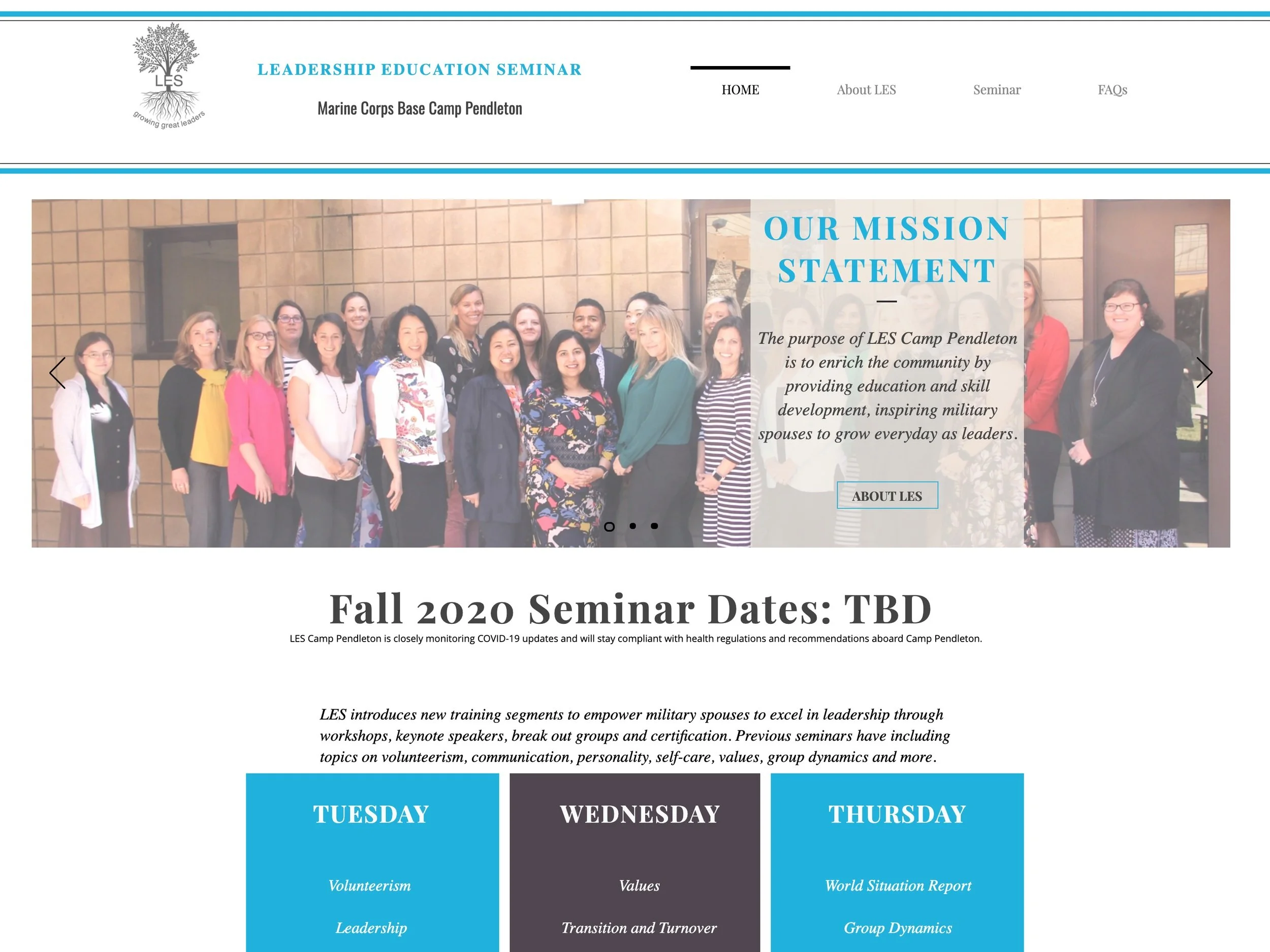 The purpose of LES Camp Pendleton is to enrich the military spouse community by providing education and skill development to inspire military spouses to grow everyday as leaders through a three day seminar that teaches techniques for personal and professional development.